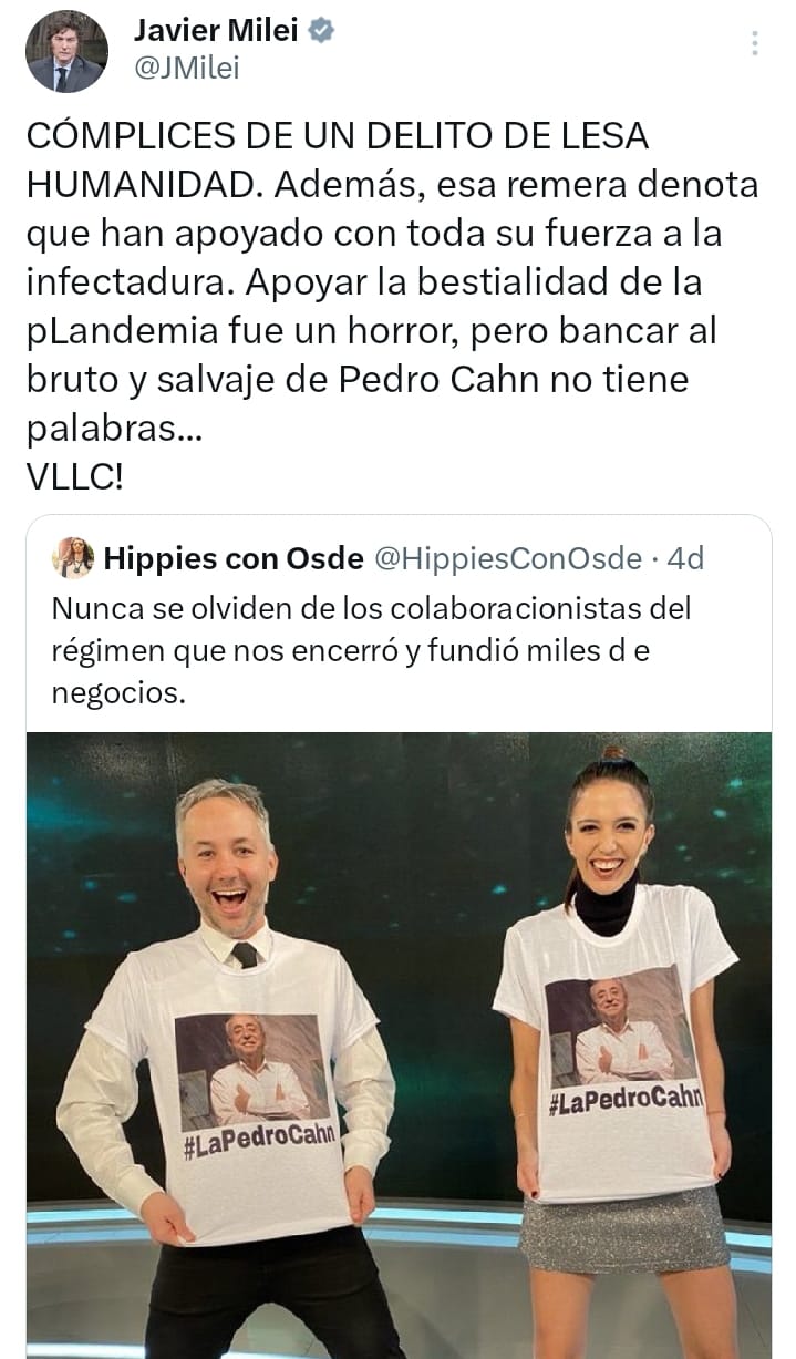 El presidente Javier Milei volvió a endurecer su postura sobre la gestión de la pandemia de COVID-19 durante el gobierno kirchnerista de Alberto Fernández. Con un posteo lapidario publicado el domingo 22 de marzo, respondiendo a un mensaje del usuario @HippiesConOsde que recordaba a los “colaboracionistas del régimen que nos encerró y fundió miles de negocios”, Milei escribió sin pelos en la lengua: “CÓMPLICES DE UN DELITO DE LESA HUMANIDAD. Además, esa remera denota que han apoyado con toda su fuerza a la infectadura. Apoyar la bestialidad de la pLandemia fue un horror, pero bancar al bruto y salvaje de Pedro Cahn no tiene palabras… VLLC!”